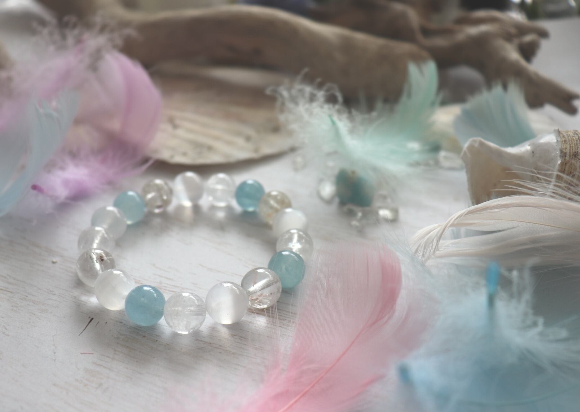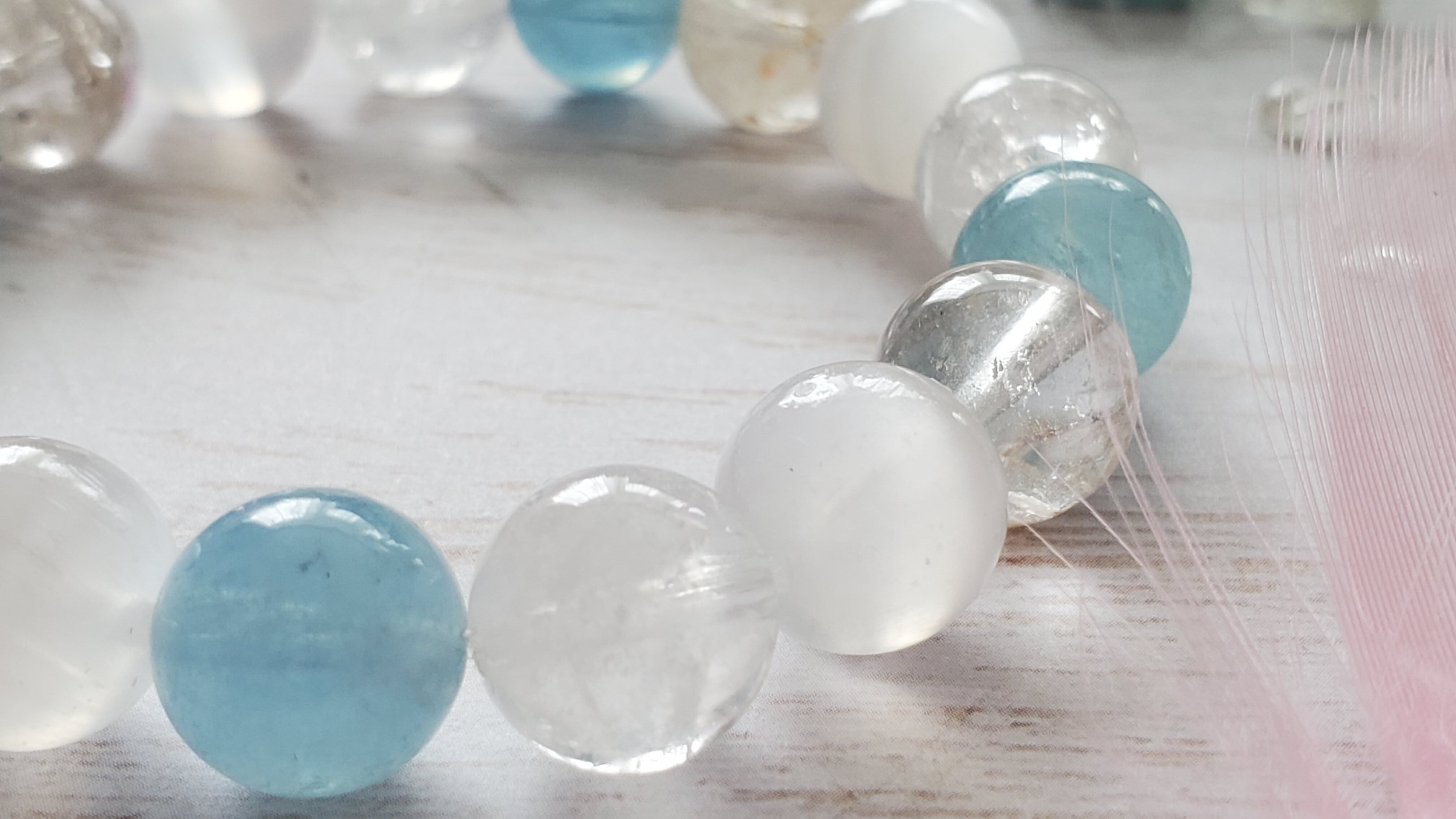 透明感のあるアクアマリン、ヒマラヤの氷河の下から発見されたアイスクリスタル、白い天使のエネルギーのホワイトスノールチルクォーツと合わせ、ふんわりと清涼☽・:*で、優しいブレスレットに仕上げました(*^^*)