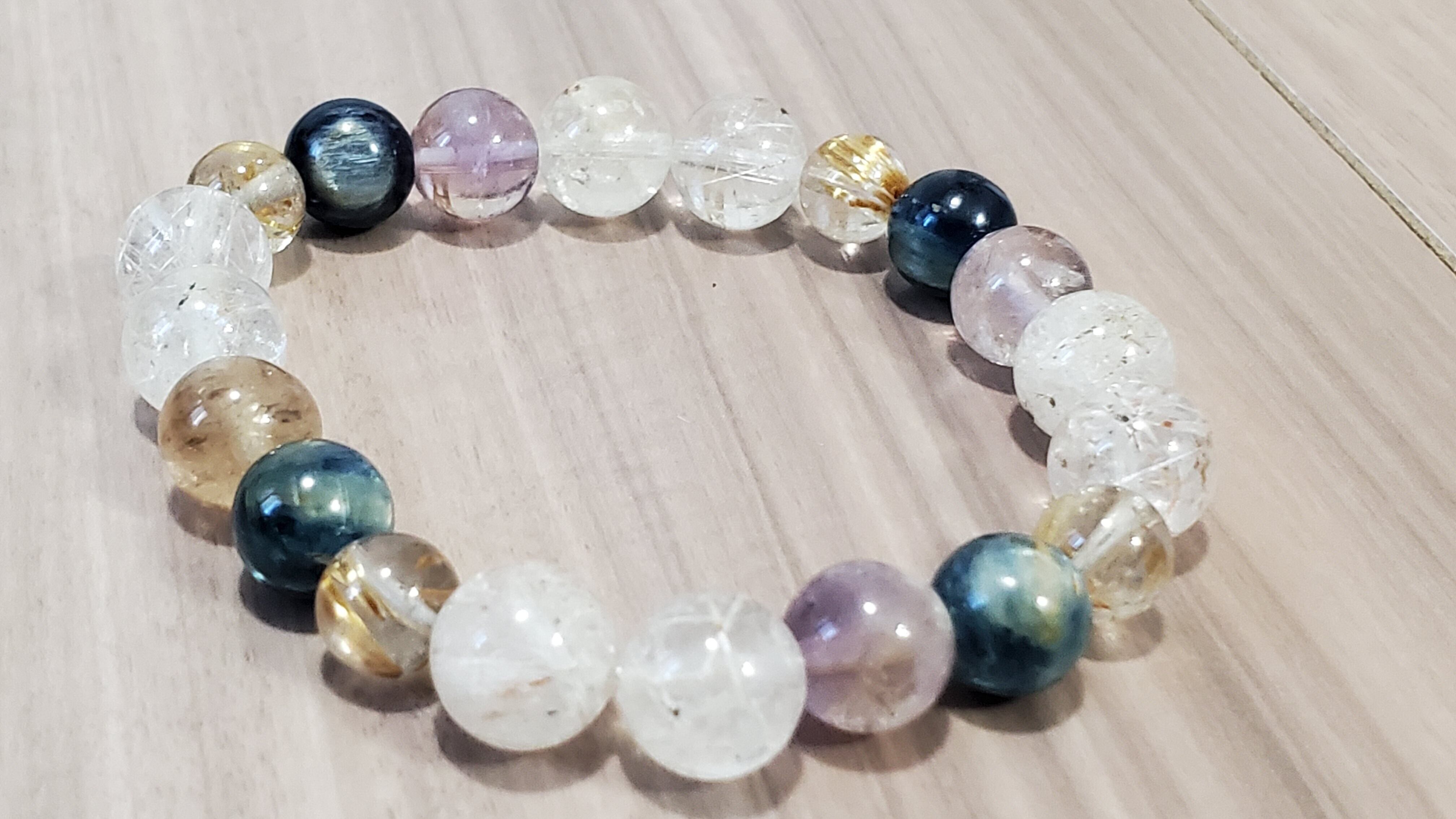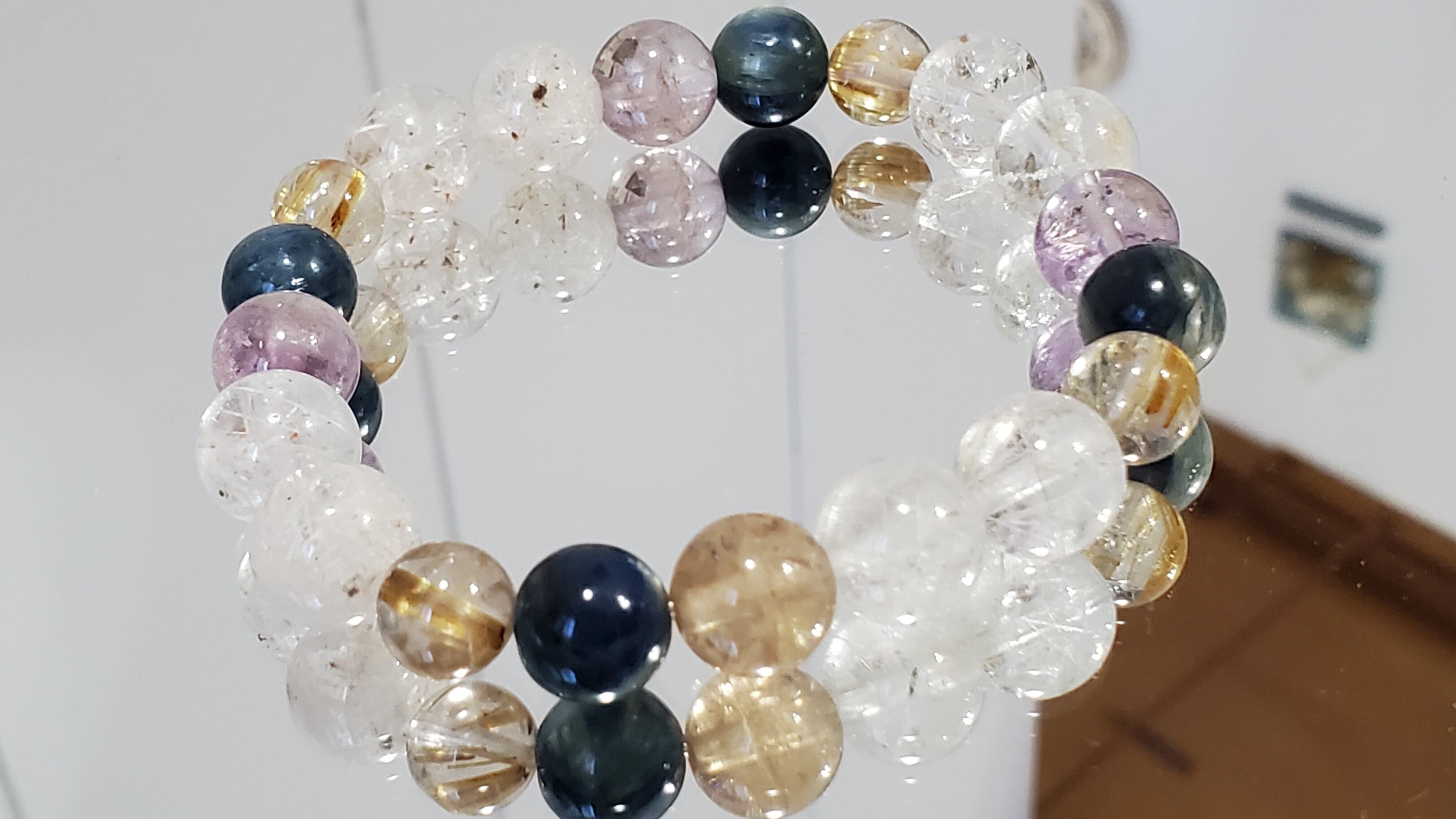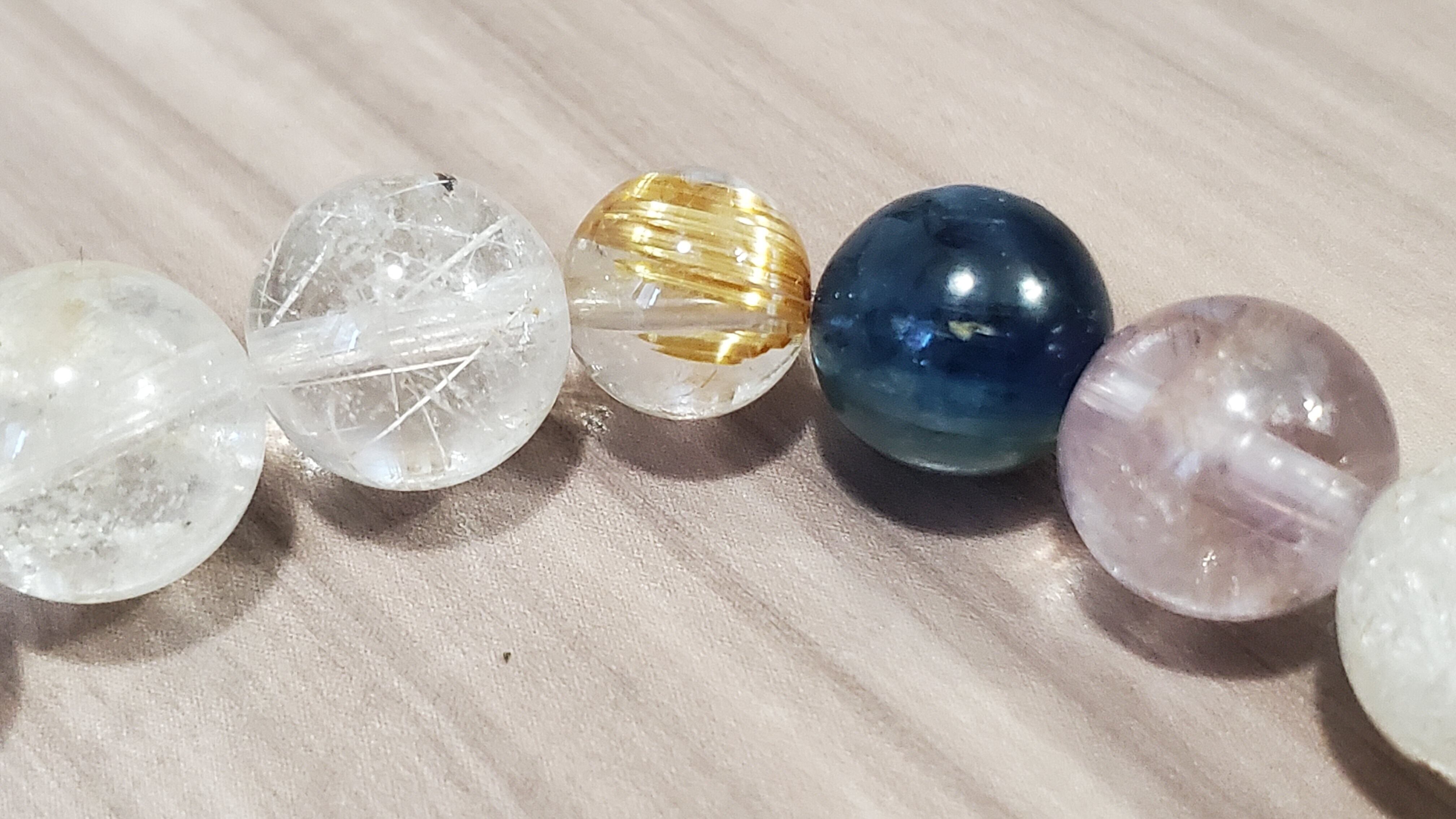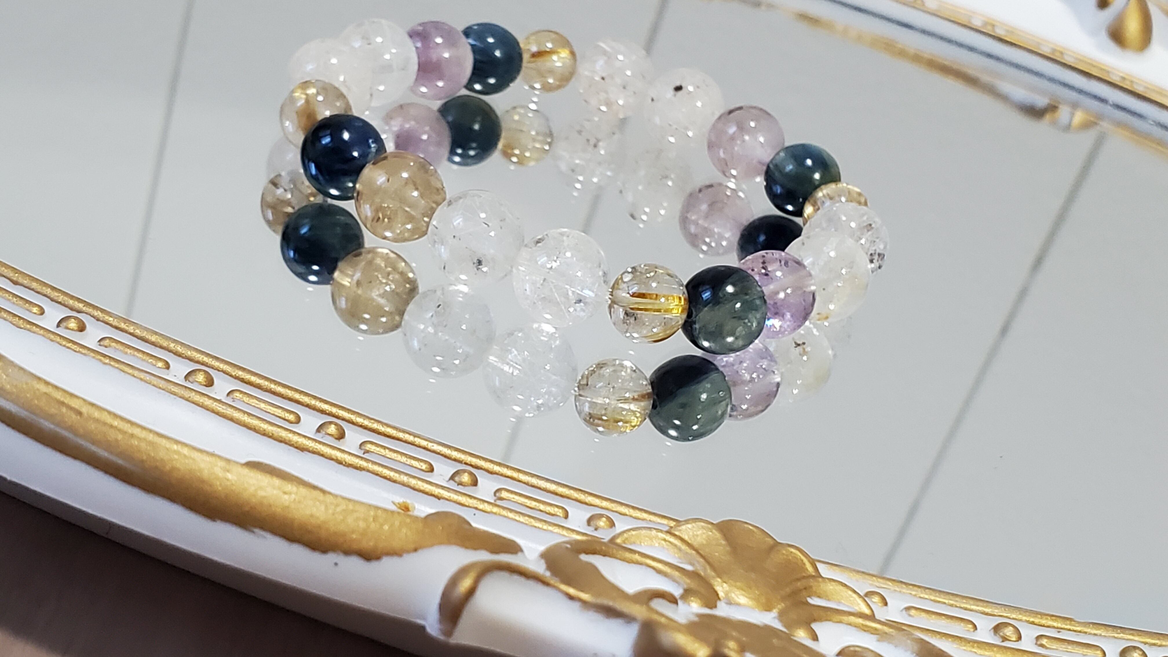 「ゴールデンルチルクォーツ」と「アメトリン」で豊かさを呼び、「ホワイトスノールチルクォーツ」が天使の守護と恵を、「タンザニア産カイヤナイト」が判断力と明晰力を。