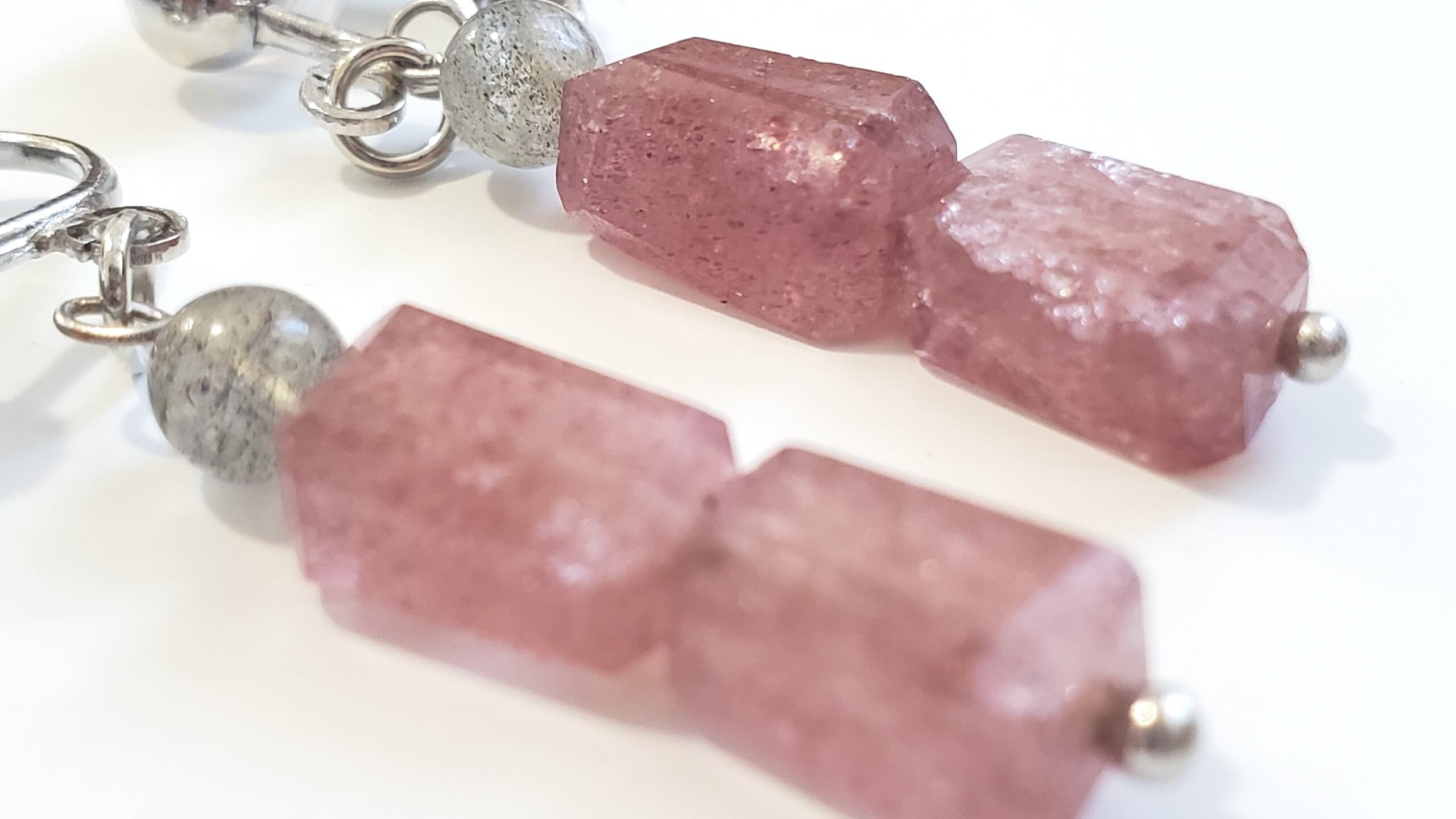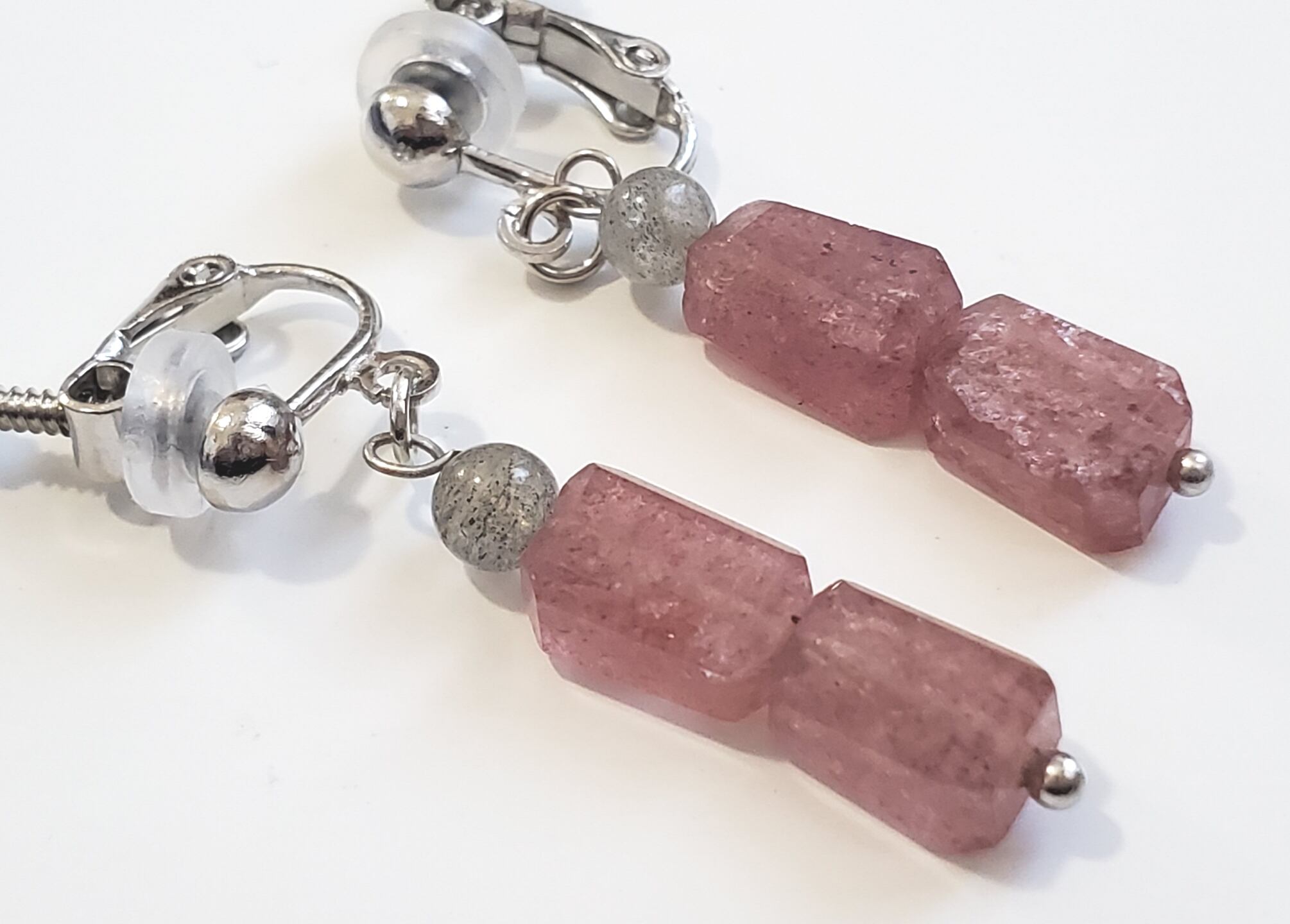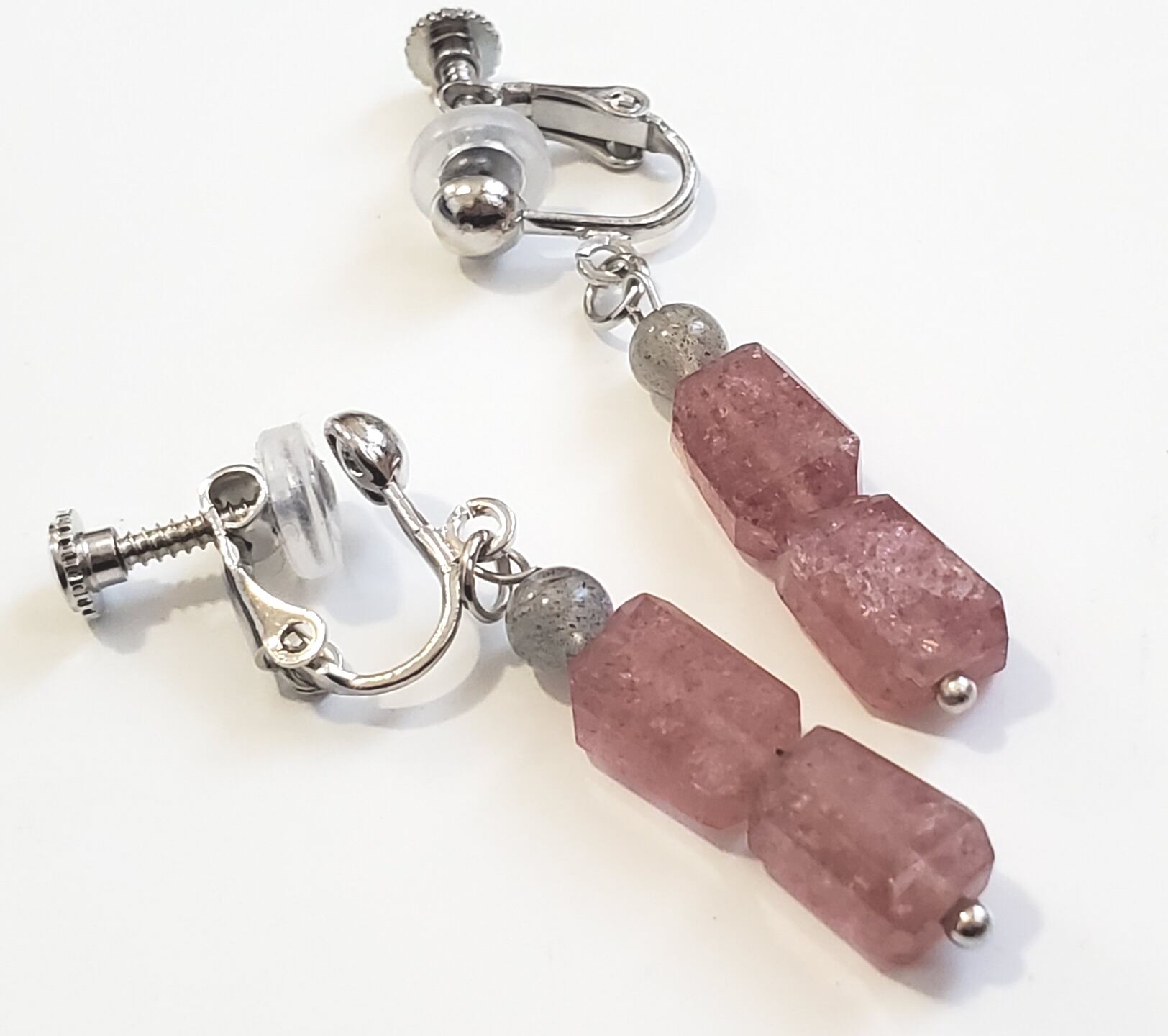 ピンクのキラキラがとても可愛らしく、耳元を明るく彩ります。また、グレーのラブラドライトからは魅惑的な輝きが放たれ、女性らしいエレガントな印象を与えます。