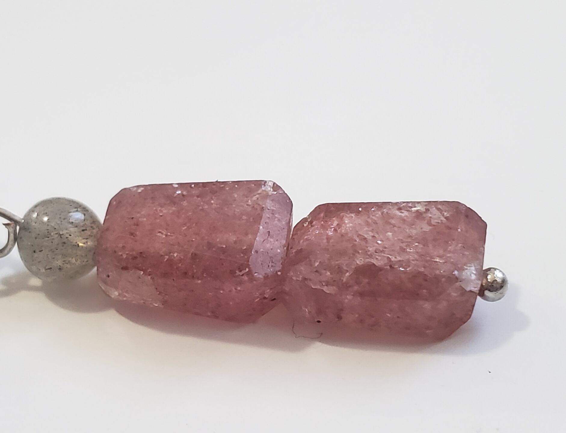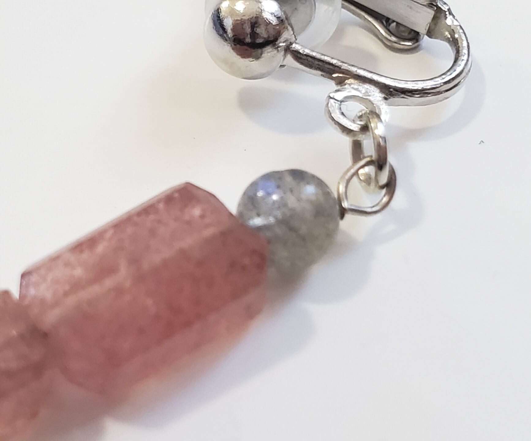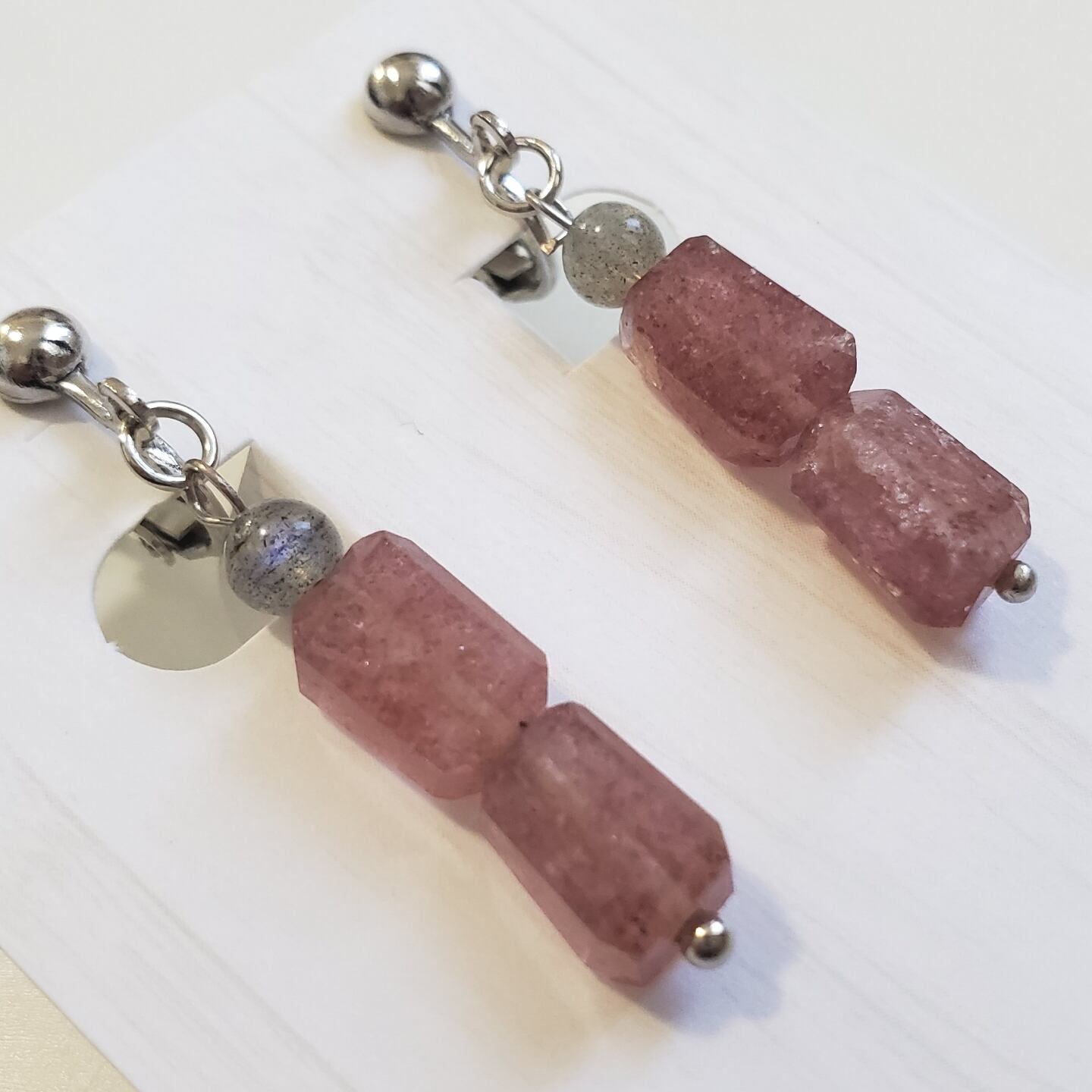 ピンクのキラキラがとても可愛らしく、耳元を明るく彩ります。また、グレーのラブラドライトからは魅惑的な輝きが放たれ、女性らしいエレガントな印象を与えます。