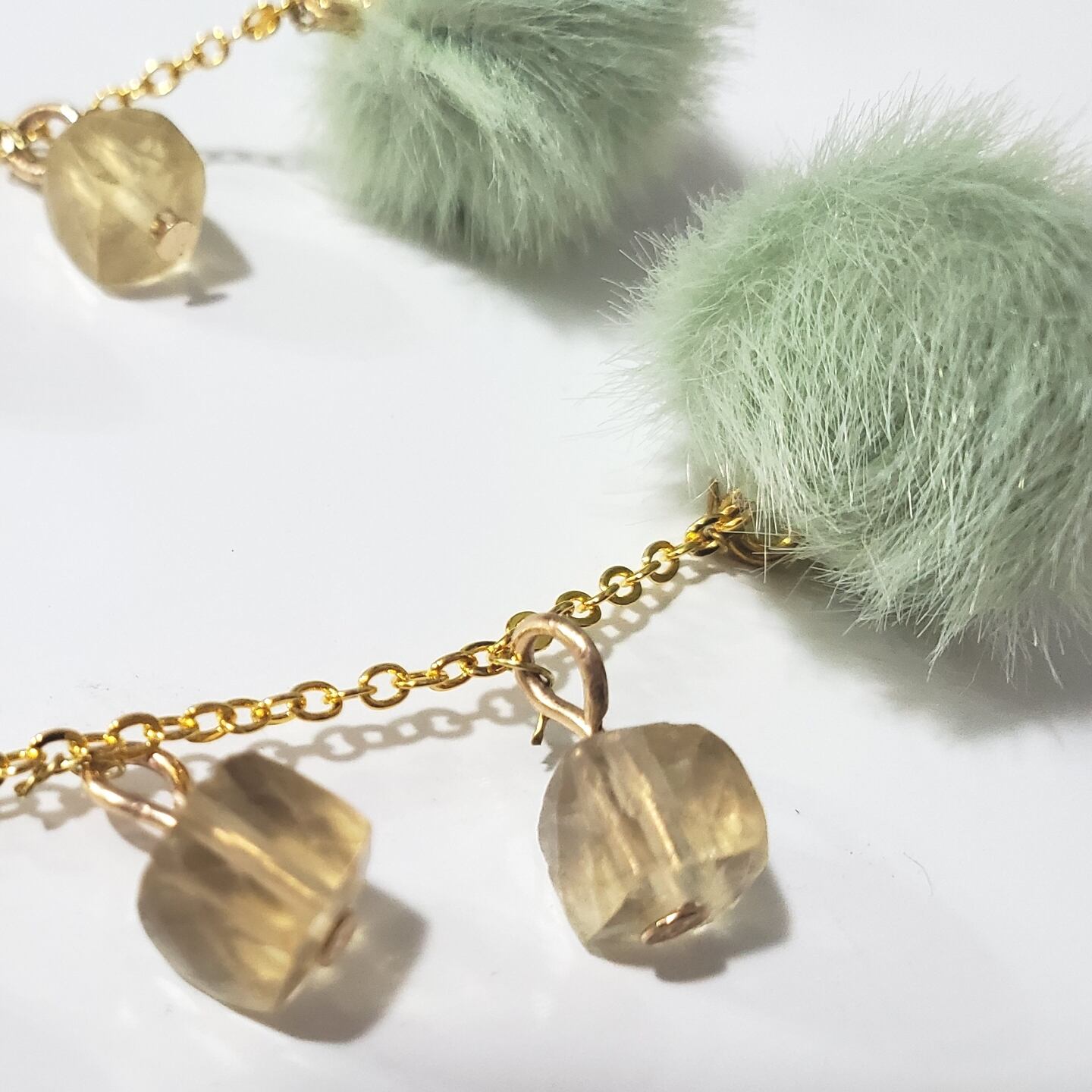 ゴールデンイエローのフローライトを、チェーンにあしらい、キラキラ感とゴージャス感も付け足しました✨